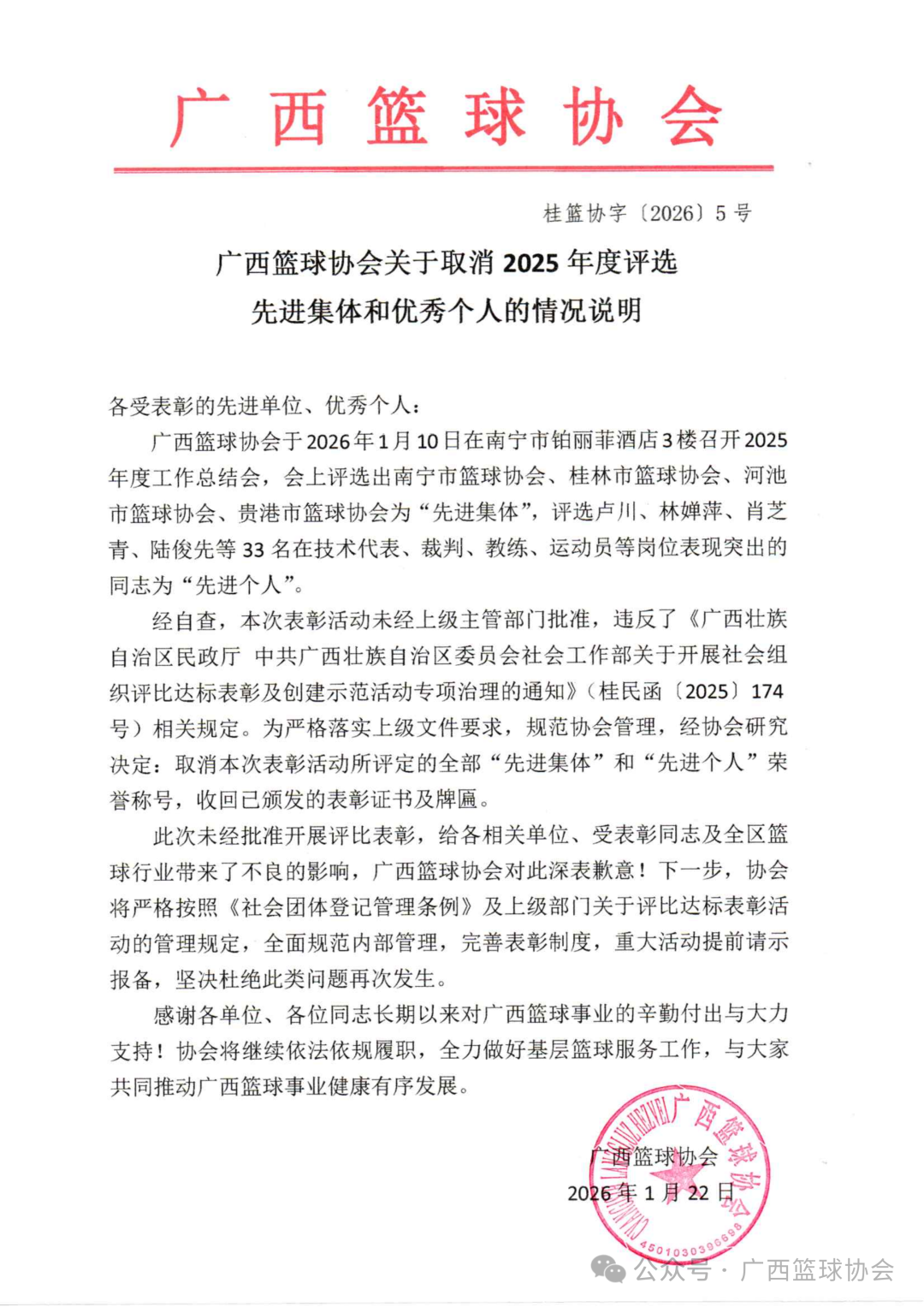 1月22日点点盈,广西篮球协会发布关于取消2025年度评选先进集体和优秀个人的情况说明: