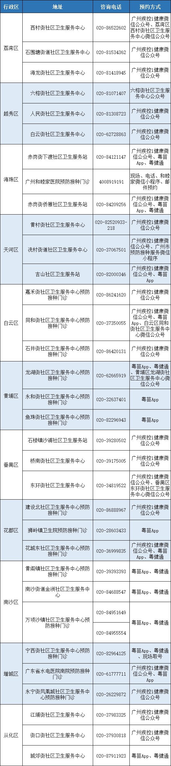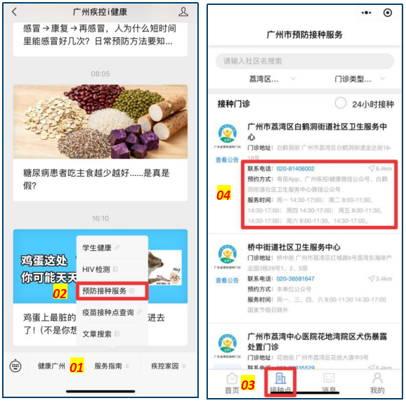点击【服务指南】-【预防接种服务】-【接种点】-【找到就近社区卫生服务中心】-【查看联系方式、预约方式、服务时间】