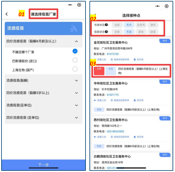 【选择意向流感疫苗类型和厂家】-【根据号源状态、疫苗状态选择】-【点击进入预约即可】
