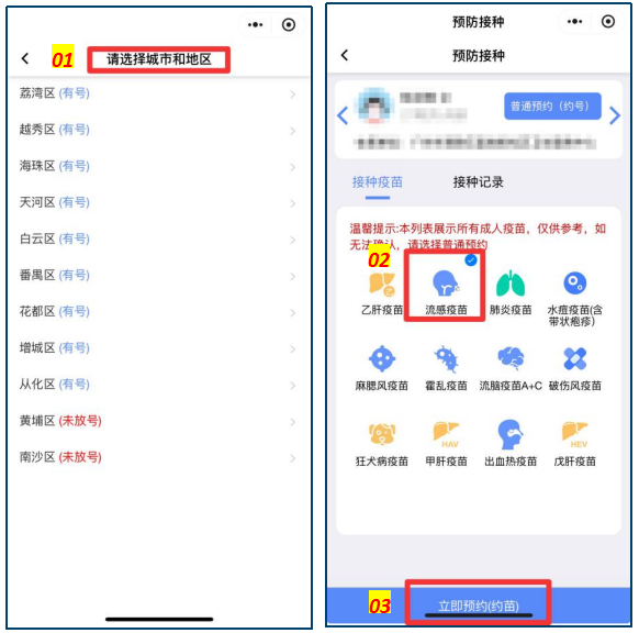 重复以上操作进入【预防接种服务】(或直接微信搜索“广州市预防接种小程序”)-【儿童/成人预约】-【选择地区】-【选择流感疫苗】-【立即预约】