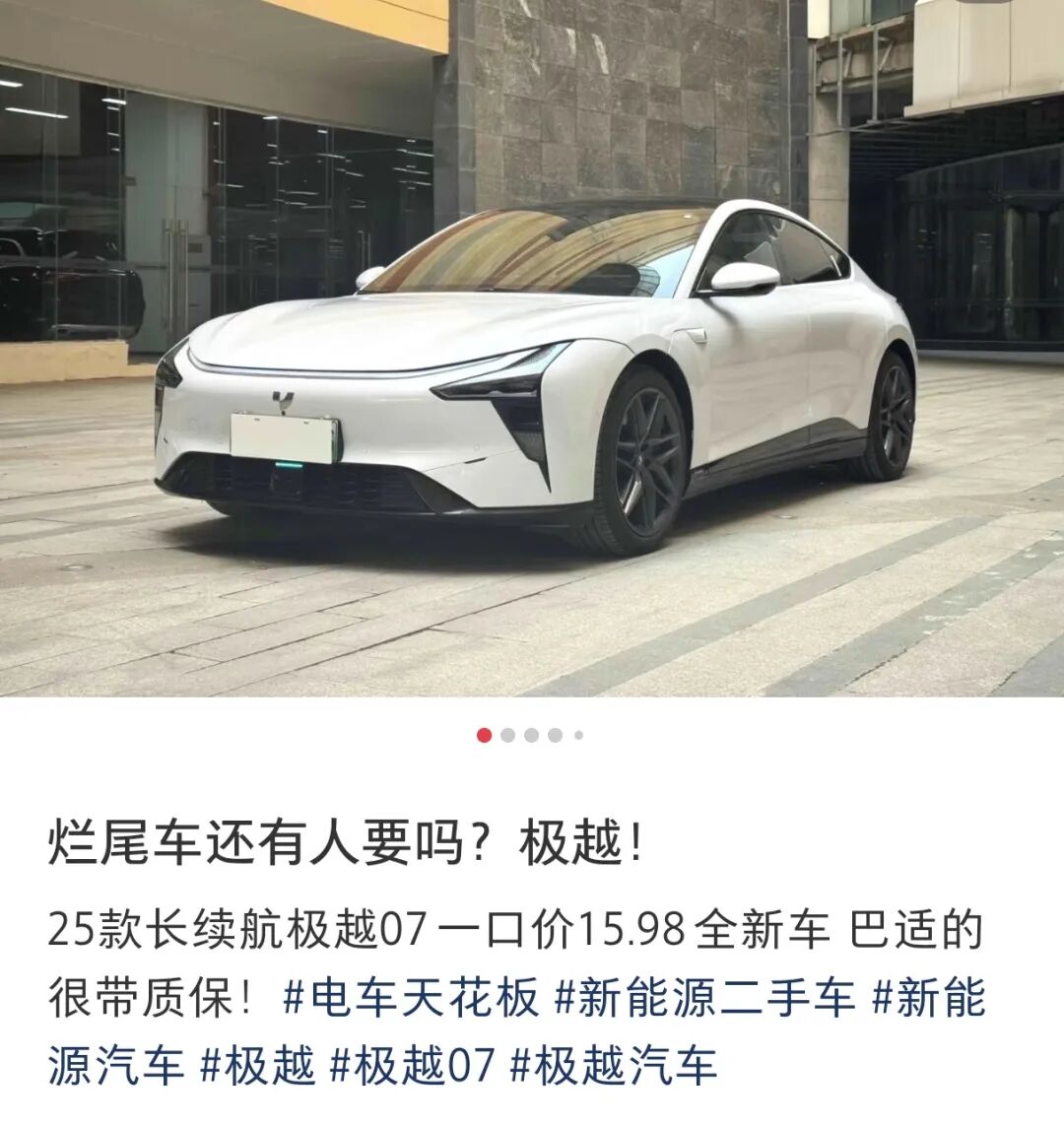 在极越倒闭之后,有二手车商以“打包价”的价格收购了752辆极越新车,“双十一”当天就卖掉40多辆极越,去化率超过50%。