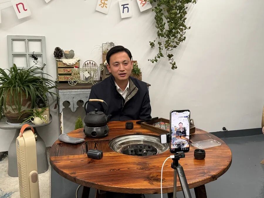 白永坤在民宿开直播,解释取消杀猪宴活动的原因。