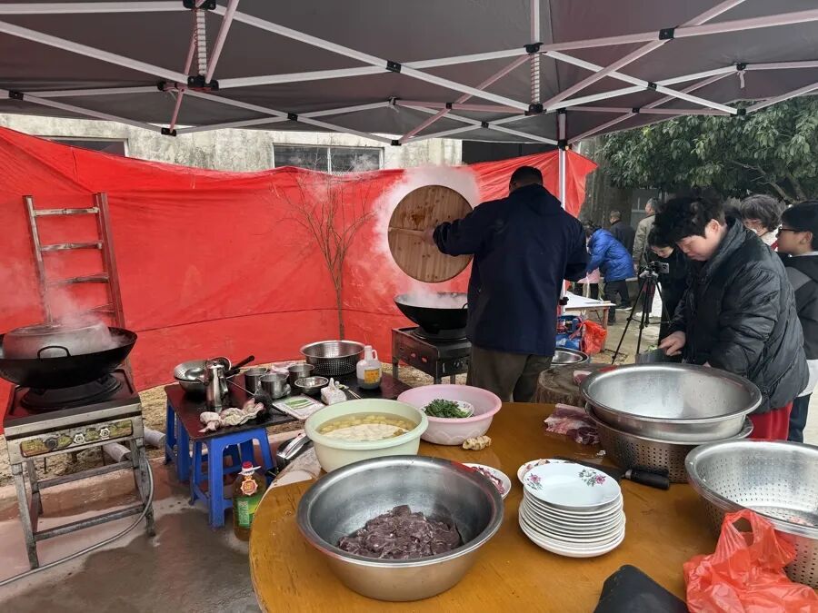 “我们今天网友‘奔现’,就算是过个年了。”“以前外婆家每年过年都会杀年猪,两三桌人一起吃猪肉,很有年味。”“现在杀年猪的场面难得一见,特定带小孩过来‘见世面’。”陌生人坐在同一张桌子上七嘴八舌聊着,人与人之间温情的连接此刻具象化了。