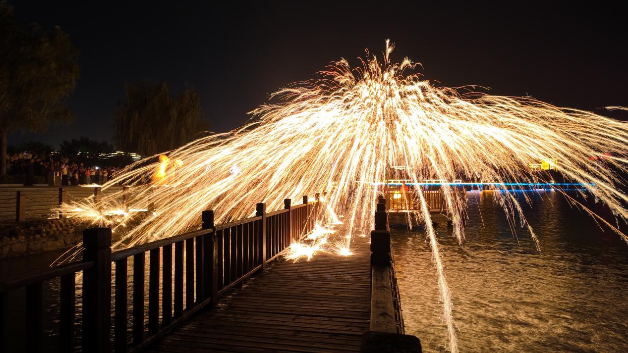 馆陶县公主湖美食嘉年华活动现场,打铁花表演。馆陶县委宣传部供图