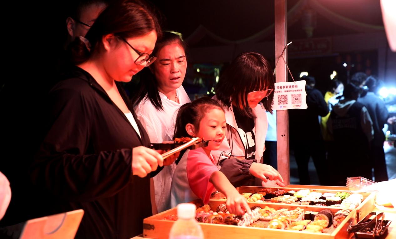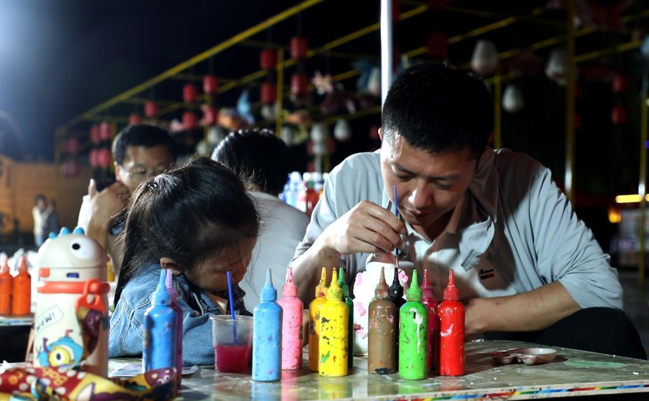 华灯初上,馆陶县金凤大道人流如织,热闹非凡。公主湖湿地公园和馆陶博物馆广场上,各式各样的美食摊位一字排开,吸引着居民游客的目光和味蕾。寿司、炸串、冰激凌……每一家美食摊位前都是熙熙攘攘的人群。游乐区也人头攒动,套圈、射击游戏、旋转木马……各式各样的游乐设施让孩子们兴奋不已,家长们在一旁拍照留念,享受着幸福的亲子时光。